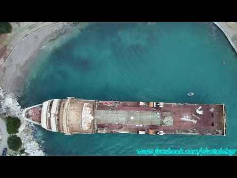 Εναέριες εικόνες από το εγκαταλελειμένο πλοίο "Μακεδονία" της SAOS Ferries το οποίο παρασύρθηκε από τον ισχυρό νοτιά και προσάραξε στις ακτές της Σαλαμίνας