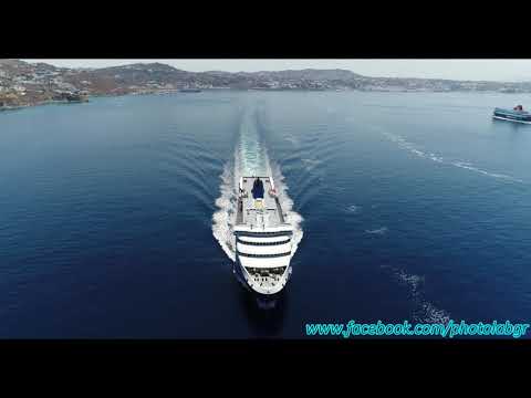 To F/B Superferry, της Golden Star Ferries, τραβηγμένο από αέρος σε μια καλοκαιρινή του αναχώρηση από το νέο λιμάνι της Μυκόνου.